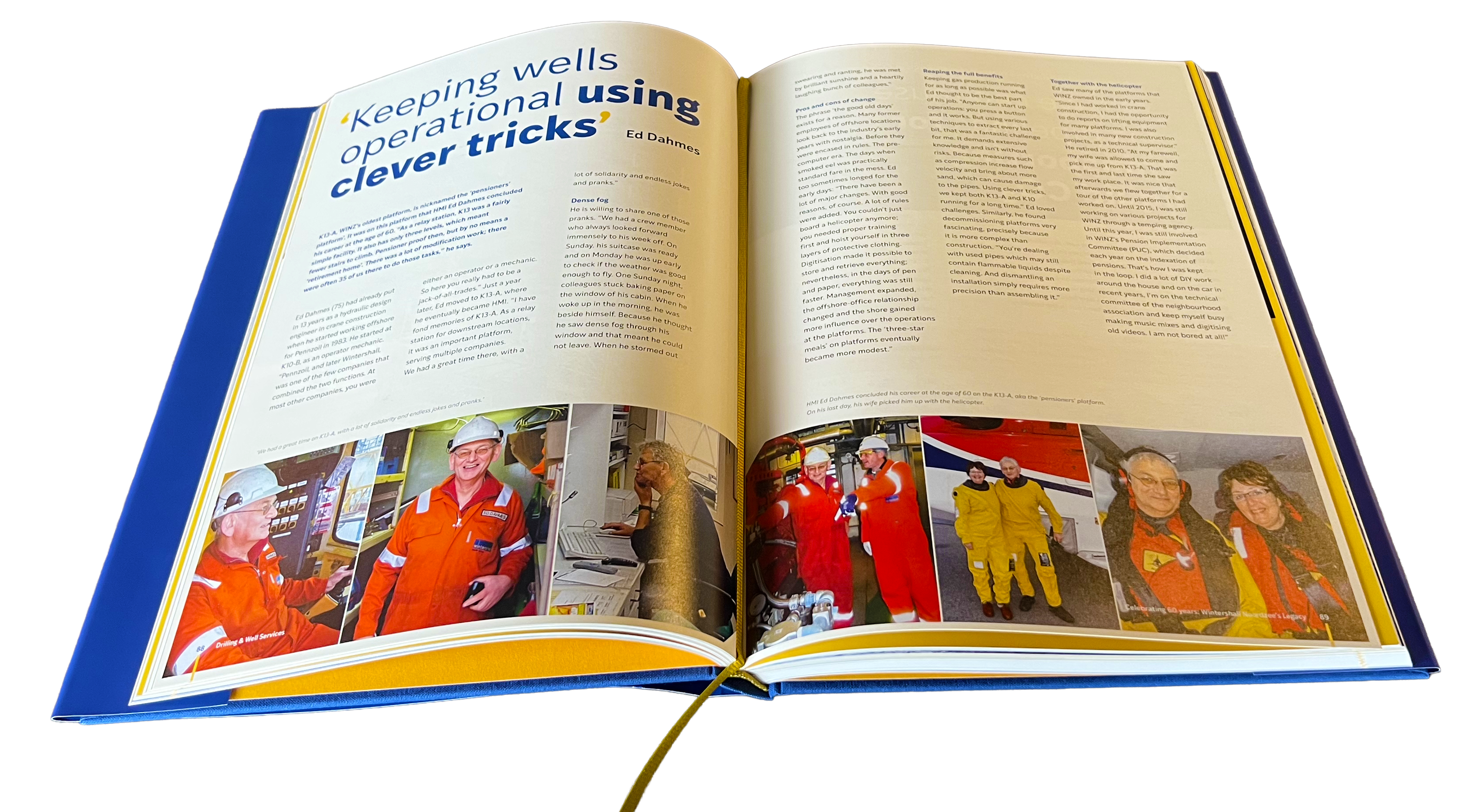 Die jarenlange geschiedenis vraagt om een mooi overzicht in een fraaie vormgeving. Iets waar Stijlmeesters en The Mindoffice graag hun steentje aan bijdragen. Een uitgebreide inhoudsopgave vormde de basis vanuit waar we alle artikelen verdeelden over ons team. Meer dan 50 bijzondere verhalen stonden op de lijst. Daarvoor spraken we tientallen (oud-)medewerkers en maakten onze toetsenborden overuren om alle informatie te verwerken. In ongeveer twee maanden tijd vinkten we alle artikelen af, zelfs nog speciale verhalen die er op het laatste moment bijkwamen. Want hoewel we vooraf samen met Wintershall Noordzee een inhoud samenstelden, werd die gedurende het project continu geperfectioneerd.