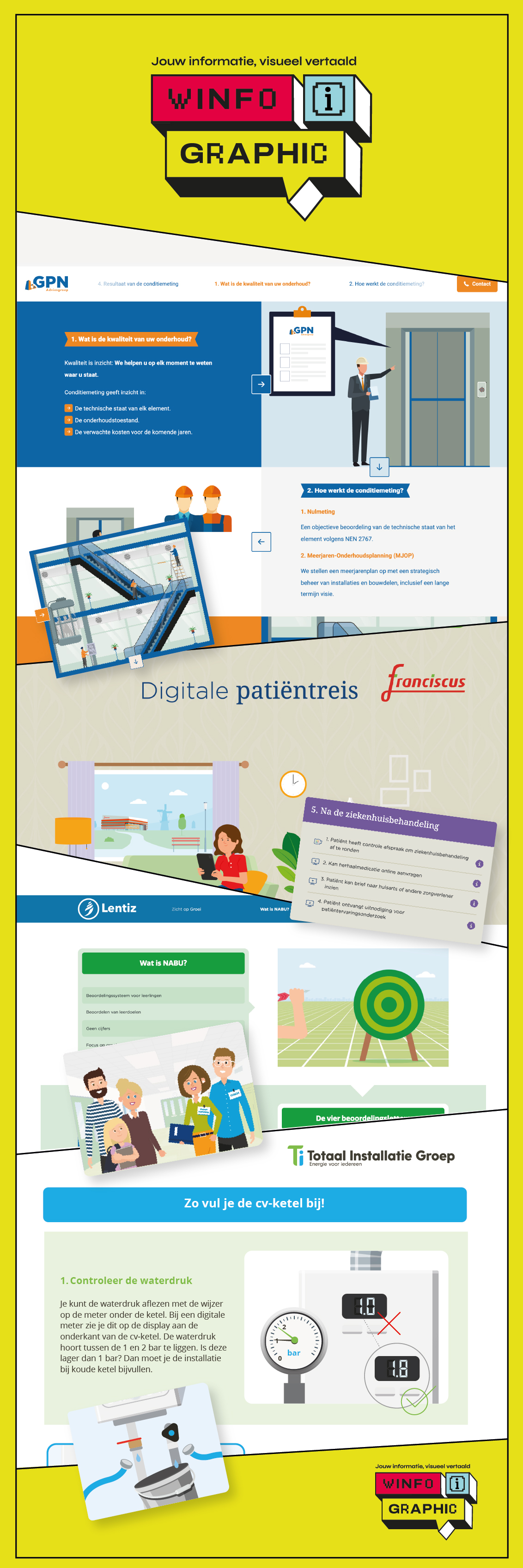 Met name de technische wereld leent zich voor infographics. Neem bijvoorbeeld het stappenplan voor het bijvullen van de cv-ketel. Geen alledaagse klus, maar wel iets dat woningeigenaren zelf zouden kunnen doen, mits ze de juiste instructies hebben. Daarom maakten we voor installatiebedrijf Totaal Installatie Groep een bewegende winfographic aan de hand waarvan mensen thuis zelf de cv-ketel kunnen bijvullen.