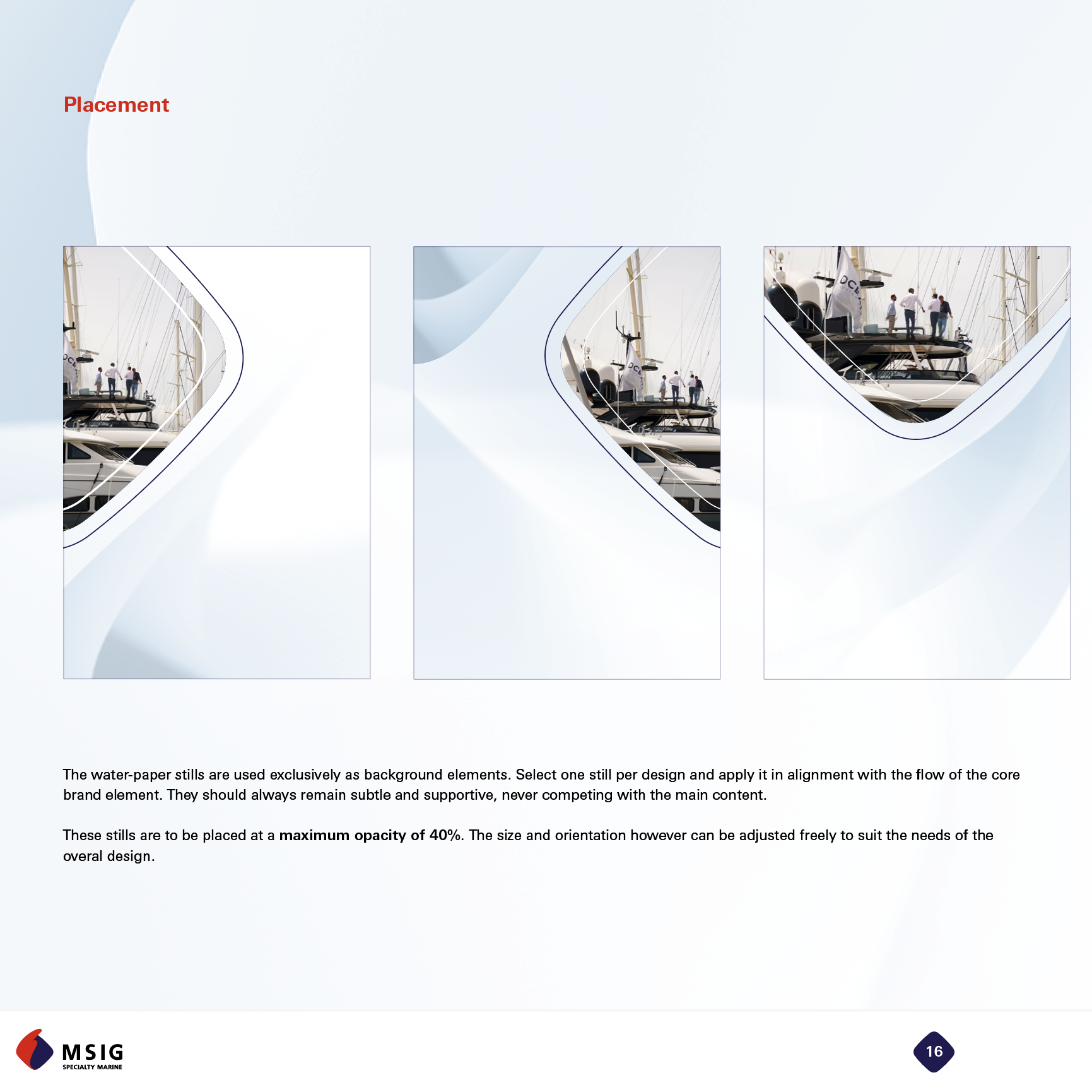 De huisstijl van MS Amlin stond al, maar voor MSIG Specialty Marine werden we wel gevraagd hierin enkele kleine wijzigingen aan te brengen. Een voorbeeld is de diamantvorm die onder andere voorkomt in het logo van het bedrijf. Deze maakte al deel uit van de huisstijl, maar wij zagen kansen om deze nadrukkelijker in te zetten. We voegden hier een bewegend effect aan toe met een dubbele betekenis. Enerzijds lijkt dit op het omslaan van papier, anderzijds herken je er een golfbeweging in. Hier komen de marine- en verzekeringswereld dus samen. De golven laten we daarom overigens vaker terugkomen. Tot slot legden we de bestaande huisstijl vast in een gloednieuw brandbook. Zo ligt er een vaste basis die de continuïteit binnen MSIG Specialty Marine de komende jaren bewaakt!